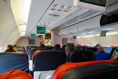 Interior of airplane with passengers on seats waiting to taik off. Horizontal composition. boring flight in economy class aircraft salon. economy class