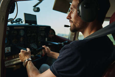 Confident professional pilot flying aircraft while sitting at plane cockpit and focusing on using control panel. Attractive pilot looking and checking control panel while seated at flight deck. AIG42.