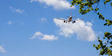 Odessa, Ukraine - CIRKA 2019: Passenger airplane in the air with landing gears lowered before boarding at the airport under different racks as an illustrative editorial