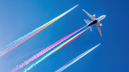 A stunning image captures a jet airplane soaring through a bright blue sky, leaving vibrant contrails that create a rainbow effect, symbolizing freedom and adventure.
