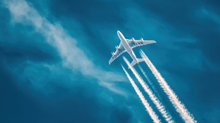 A majestic airplane soaring high in a clear sky, leaving a trail of condensation, symbolizing travel and freedom.