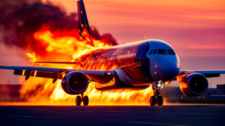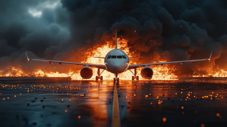 A blazing airplane sits on an airport runway during an emergency landing, with intense flames and dark smoke