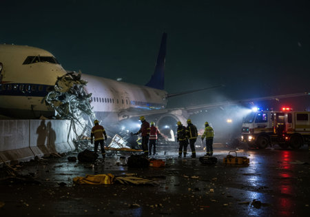 Emergency responders, firefighters, and rescuers at the scene of a simulated plane crash or disaster with a damaged aircraft at night.