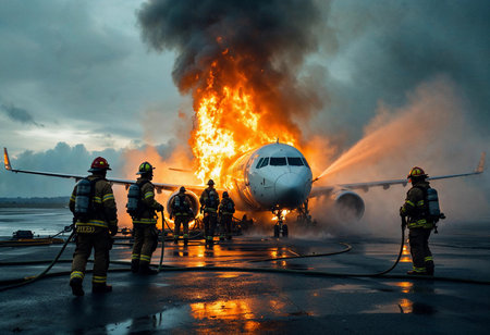 In a tense moment, firefighters confront a fierce blaze engulfing an aircraft at an airport. Dark clouds loom overhead as they work tirelessly to extinguish the flames and protect nearby areas.