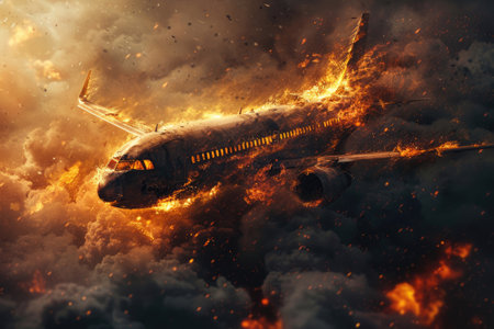 An airplane is engulfed in flames and smoke. The scene depicts a dramatic event, with fiery explosions against a cloudy sky. The composition emphasizes the scale of the aircraft and the intensity of the fire. The image might be suitable for illustrating topics related to aviation, emergencies, or disasters.
