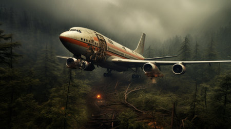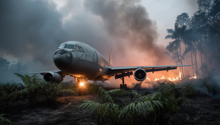Airplane burning in a tropical forest fire, creating a dramatic scene of destruction and environmental damage