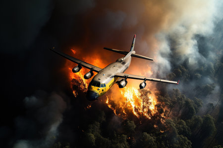 A firefighting plane releases its load of water to extinguish a fire, AI Generative.
