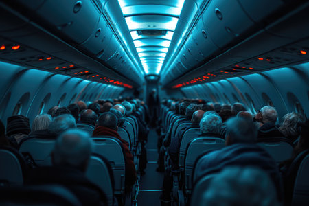 Interior inside of the plane with passengers.