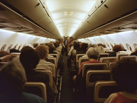 Aircraft passengers sit in their seats. Something is happening at entrance to plane. Someone rises from their chairs. Back view. Generative AI