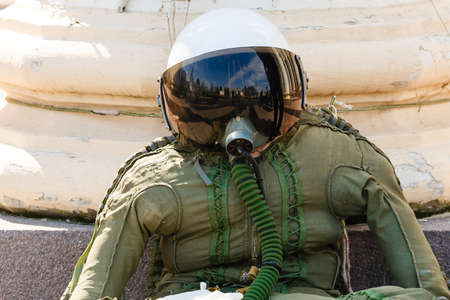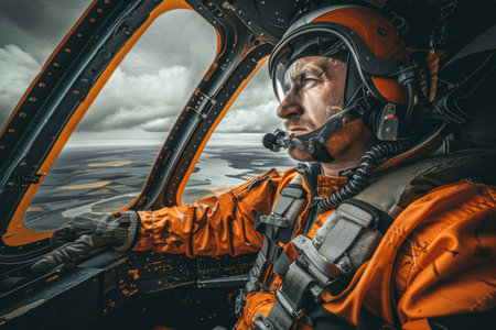 Experienced Pilot in Flight Suit and Helmet Navigating Aircraft, Aerial View, Aviation Concept