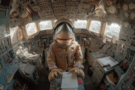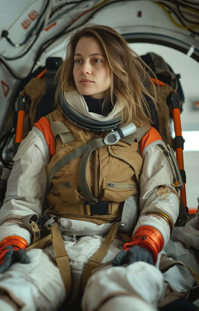 Beautiful girl in spacesuit sitting in cabin of space ship.