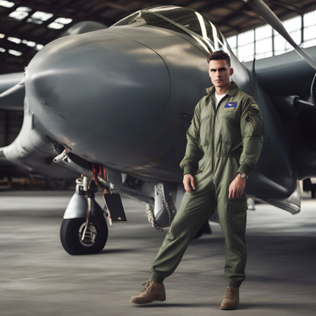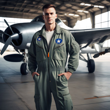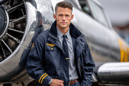 Confident male pilot in front of an airplane, epitomizing professionalism in aviation.