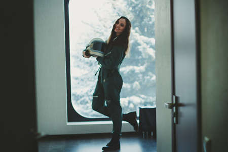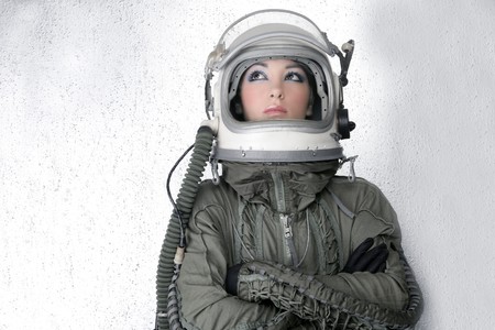 aircraft astronaut spaceship helmet woman fashion portrait over silver