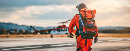 Paramedic hurrying to helicopter at landing pad EMT air rescue scene. Concept Emergency Response, Helicopter Landing, EMT Team, Medical Transport, Rescue Operation