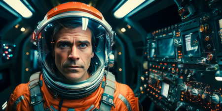 Astronaut in orange suit inside a spacecraft, realistic style, detailed cockpit background, concept of space exploration. Generative AI