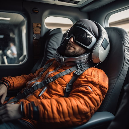 Astronaut in helmet and spacesuit sitting in a spaceship.