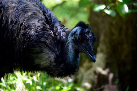 Black Feathered Emu Dromaius Novaehollandiae Looking into Green Nature Outdoors on a Hot Sunny Summer Day
