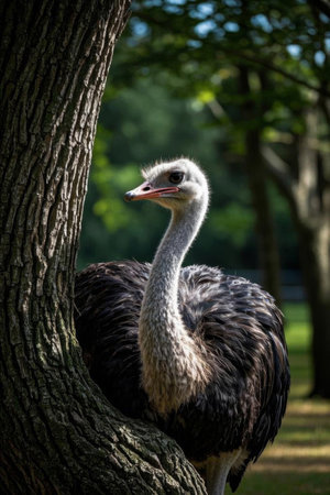 an ostrich stands in front of a tree, its gaze fixed on something in the distance. this aggressive digital illustration captures the essence of the majestic bird. the light gray and dark amber colors add depth to the image. the macro photography showcases intricate details, such as the spiky mounds on the ostrich's feathers. this exotic bird is a perfect subject for a national geographic