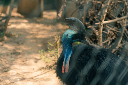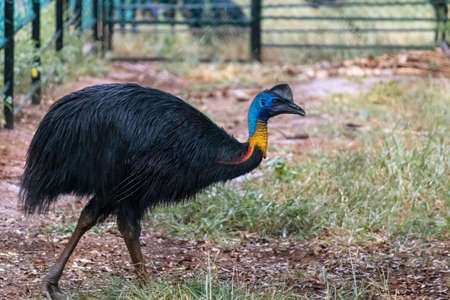 Close-up of a cassowary bird with a deep blue neck in the cage. High quality photo