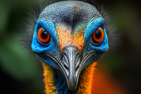 Close-up portrait of a Southern Cassowary showcasing its vibrant blue, orange, and black plumage, creating a striking and captivating image