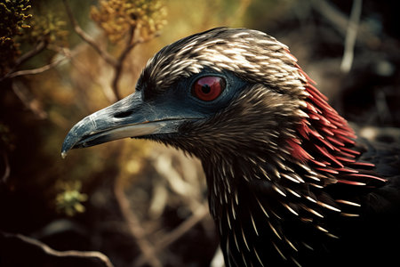 A captivating close-up of a bird with intense red eyes and a detailed beak, showcasing its unique features.