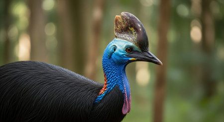 Colorful cassowary in its rainforest habitat, bright plumage.
