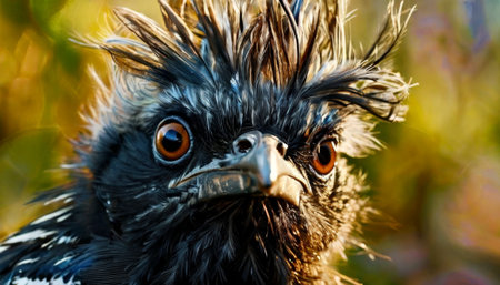 Close-up of a black bird with expressive eyes and spiky feathers