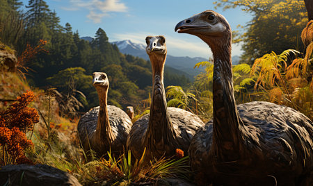 Group of Emu birds in the wild jungle. AI Generated.