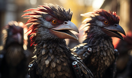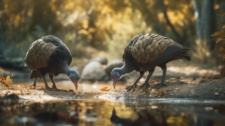 Close-up photo on the open beaks of rabid turkeys. Turkey as the main dish of Thanksgiving for the harvest. An atmosphere of joy and celebration.