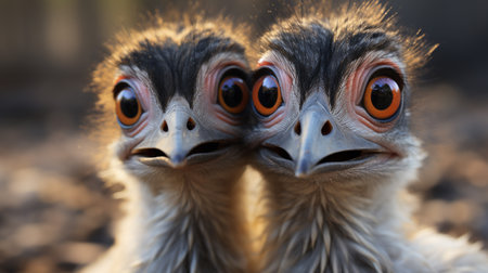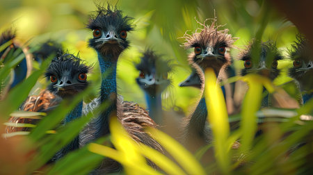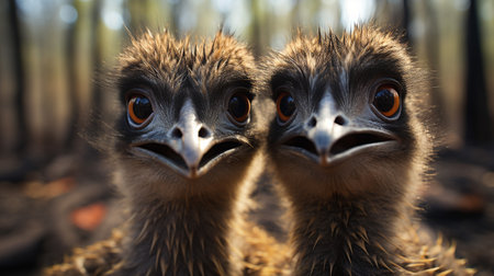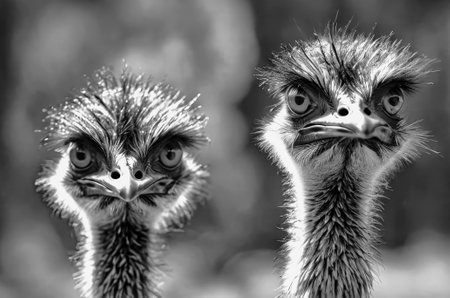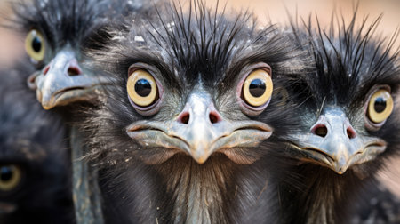 Aussie a group of Emu birds with large eyes in the wild, showing a front view of head with large eyes, black and white photo. AI Generated