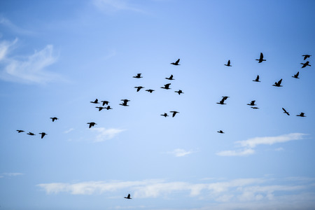 A flock of Black Cormorants flying in blue sky. The great cormorant, Phalacrocorax carbo, known as the great black cormorant, or the black shag.