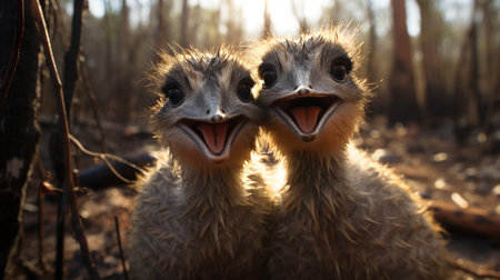 Portrait of baby emu with open mouth on nature background..