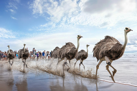 Several ostriches sprint along the shore while beachgoers observe the unusual sight in the background.
