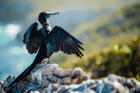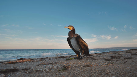 Cormorant perching near shoreline, black sea coast in crimea, moonlit sky highlighting dark waterbird silhouette