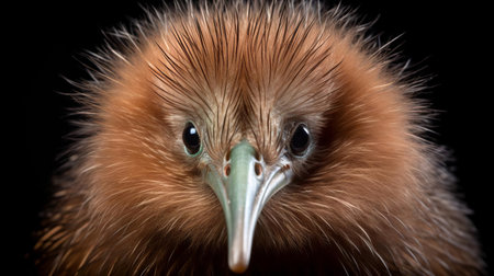 the kiwi bird's passport photo showcases its unique features, with its small size, round body, and fuzzy feathers captured in stunning detail through the 50mm lens, highlighting its endearing expression and curious gaze in this intimate wildlife portrait. ai generated
