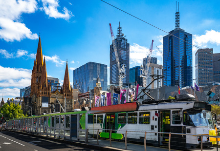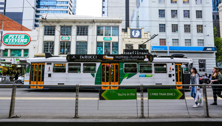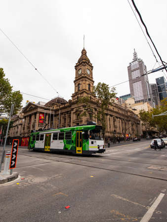 MELBOURNE, AUSTRALIA - MARCH 15, 2018 : Tram in Melbourne city center. Melbourne has the largest urban tramway network in the world. One of tourist attraction.