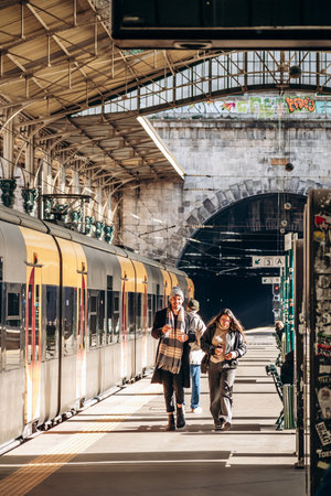 Porto, Portugal - December 28, 2024: Yellow train of Comboios de Portugal at Sao Bento station in Porto, Portugal