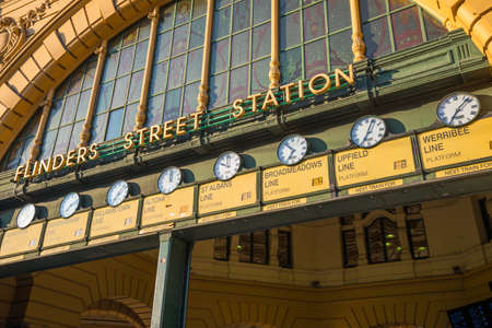 Melbourne Australia - March 10 2020; Flinder Street urban passenger train station lines and clockes above an entrance.