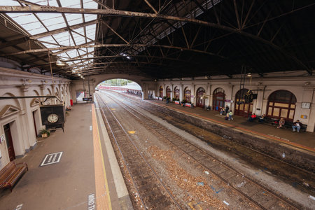 Buenos Aires, Argentina - August 29, 2019: Main train station in Retiro, with train arriving in the distance and passengres walking towards it.