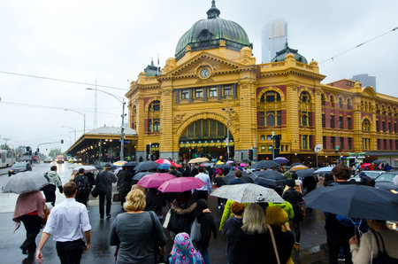MELBOURNE, AUSTRALIA - OCTOBER 24: Iconic Flinders Street Station was completed in 1910 and is used by over 100,000 people each day - 24 October 2015, Melbourne Australia,