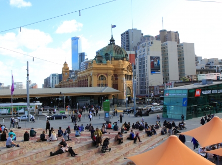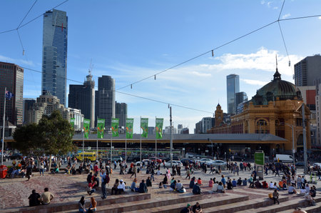 Melbourne Australia- August 10,2013, Locals and tourists resting and enjoying a sunny day at Federation Square with view of Swanston street and historic Flinders Station in Melbourne Australia