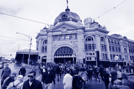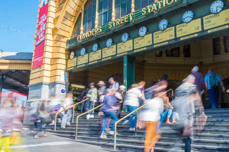 Melbourne, Australia - October 8, 2015: View of commuters in motion blur walking outside the Flinders Street Station in Melbourne during daytime.