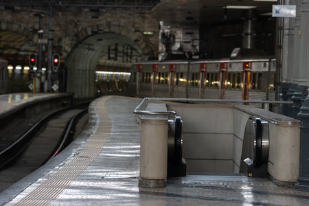 11-20-2022 PORTUGAL, LISBON: empty metro station - escalator down in the foreground