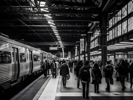 An overhead view of a busy train station with trains arriving and departing on multiple tracks, capturing the hustle and bustle of daily commuter life.