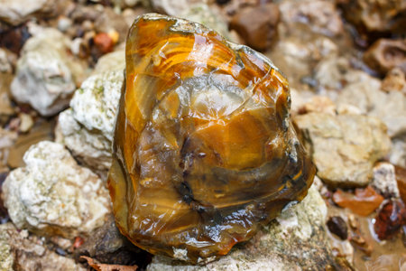 Flint nodule with concentric-zonal pattern lies on rocks near a stream, Liesegang structures shown on rocks
