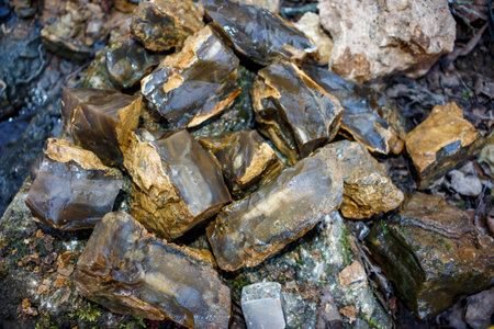 A pile of broken chalcedony stones found during a search for cutting raw materials, central Russia