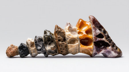 A collection of various shaped stones arranged neatly on a light background The stones exhibit different textures and colors, showcasing their natural beauty