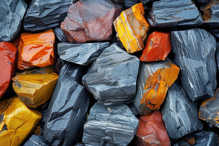Pile of black and orange mineral stones, closeup of photo