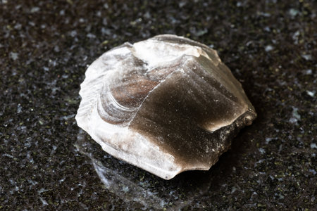 Detailed macro shot of a dark grey chert stone showing its rough surface and conchoidal fracture patterns