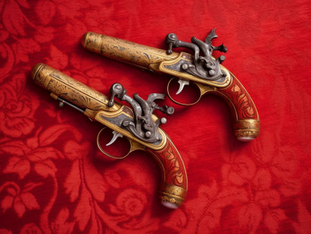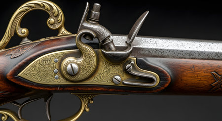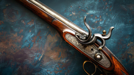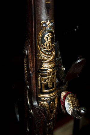 Ornate vintage flintlock pistol with intricate carvings on a polished wood background